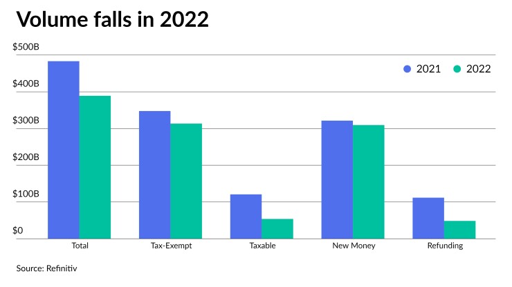 Tax-exempt issuance fell 9.9% to $313.411 billion from $347.703 billion in 2021. Taxable issuance dropped 55.4% in 2022 to $53.884 billion from $130.835 billion in 2021, per Refinitiv data.