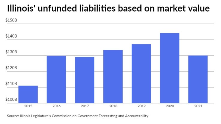 Illinois’ unfunded pension tab dropped in fiscal 2021 for the first time since 2017 and its funded health improved, propelled by investment returns that topped 20%.