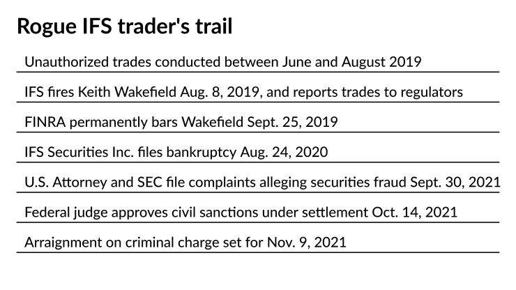 A federal judge approved civil sanctions against former IFS Securities Inc. trader Keith A. Wakefield, while a parallel criminal case advances with an arraignment set for Nov. 9.