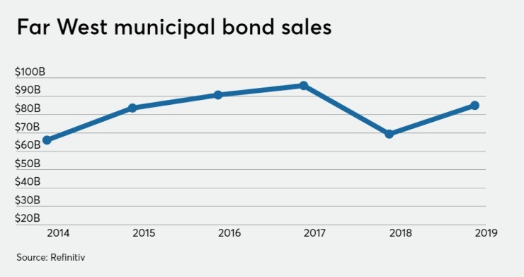 Issuers in the Far West sold $85.09 billion of municipal bonds in 2019, according to Refinitiv data, a 23% year-over-year increase helped by increasing adoption of taxable refunding structures.