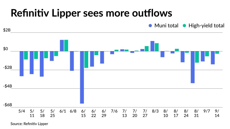 National funds had outflows of $1.201 billion after outflows of $1.040 billion the previous week while high-yield muni funds reported outflows of $266.587 million after outflows of $539.623 million the week prior.
