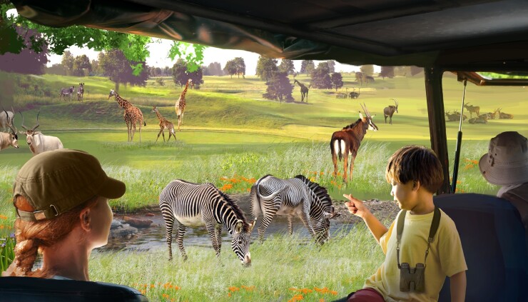The new 425-acre campus will house "a unique outdoor adventure that sends guests on a safari through herds of animals roaming wild over gently rolling grassy meadows and through native forests," according to a description of the project. "More than a safari, visitors also will explore the forests on trails and, for the more adventurous, high up in the forest canopy."
