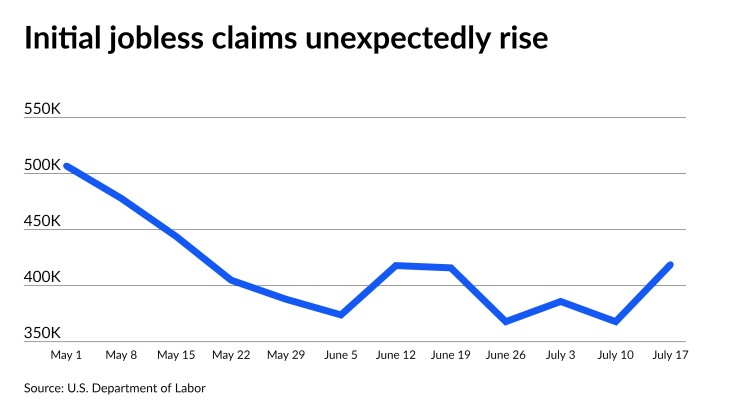 Initial jobless claims rose to 419,000 in the week ended July 17, on a seasonally adjusted basis, from an upwardly revised 368,000 the week before, first reported as 360,000 claims.