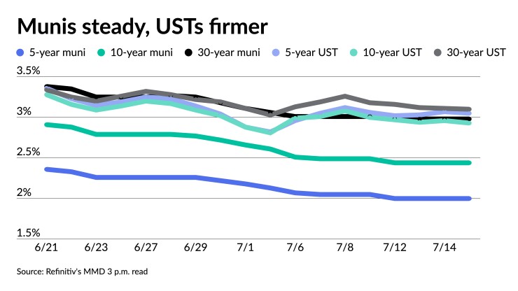 Muni to UST ratios were at 65% in five years, 83% in 10 years and 96% in 30 years, according to Refinitiv MMD's 3 p.m. read. ICE Data Services had the five at 64%, the 10 at 85% and the 30 at 97% at a 4 p.m. read.