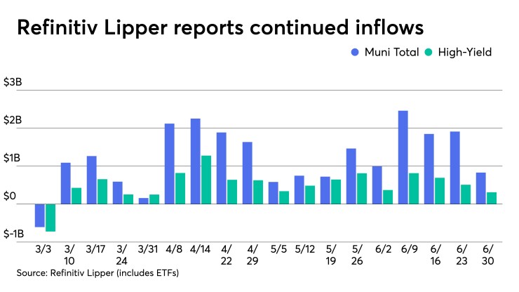 Inflows came in below $1 billion for the first time since the start of June, with Refinitiv Lipper reporting $832.221 million into municipal bond mutual funds of which $313.275 million went into high-yield funds for the week ending June 30. High-yield is on pace to return 1.27% in June and more than 6% so far this year.