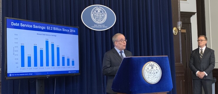 New York City has seen debt service savings in excess of $2 billion since 2014, but that the city must find more opportunities to cut costs, Comptroller Scott Stringer said at a press connference at the Dinkins Building in Manhattan Tuesday.