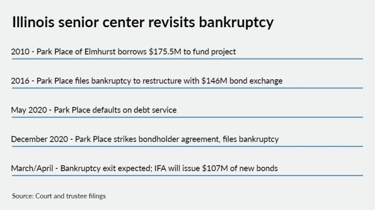 The Park Place of Elmhurst, in the western Chicago suburb of Elmhurst, filed for Chapter 11 bankruptcy in December after reaching agreement on a restructuring with holders of a majority of principal from the $141 million remaining from $146 million of bonds issued in 2016 through the Illinois Finance Authority.