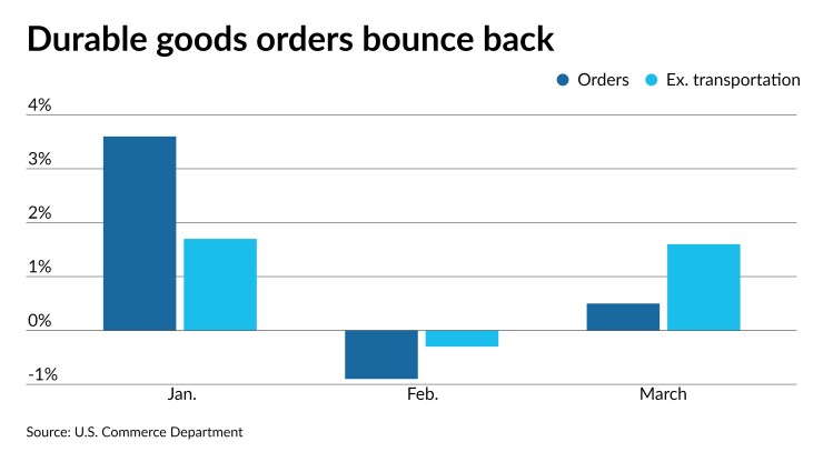 Durable goods climbed 0.5% in March, after falling a revised 0.9% in February, first reported as a 1.2% decline.