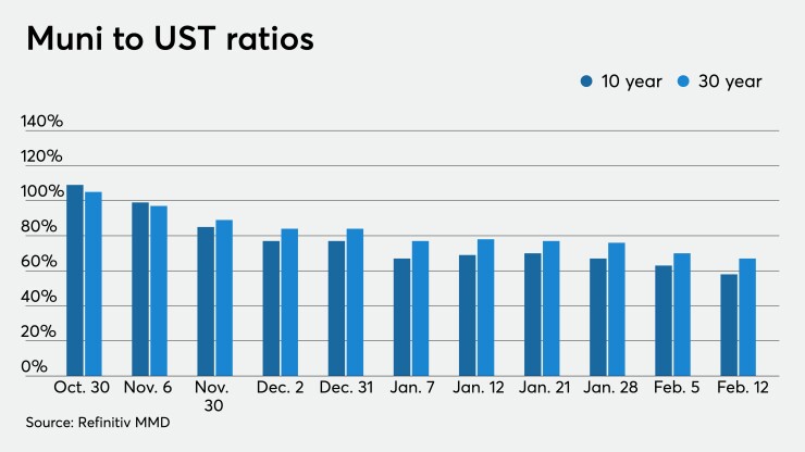 Rising U.S. Treasuries moved municipal to UST ratios lower again. They fell a basis point to 58% in 10 years and two basis points to 67% in 30 years, according to Refinitiv MMD. ICE Data Services showed ratios fell two basis points to 56% in 10 years and fell two basis points to 68% in 30. BVAL showed 10-year ratios fall two basis points to 58% and one basis point lower at 73% in 30 years.
