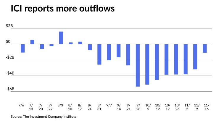 Outflows continued with the Investment Company Institute reporting investors pulled $1.084 billion from mutual funds in the week ending Nov. 16 after $3.188 billion of outflows the previous week.