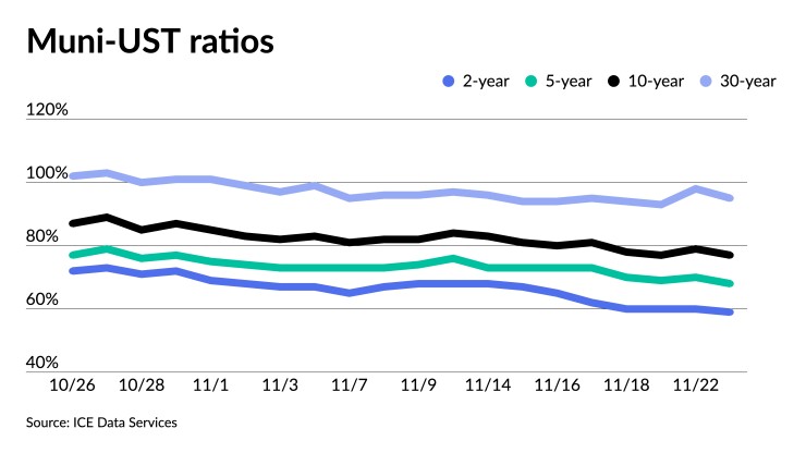 "Municipals are being propelled by limited supply conditions but also by a UST rally that is creating more favorable ratios," said Kim Olsan, senior vice president at FHN Financial. She noted that upcoming December redemptions — expected to total $26 billion — are coming up against about $10 billion of forward 30-day issuance projections.