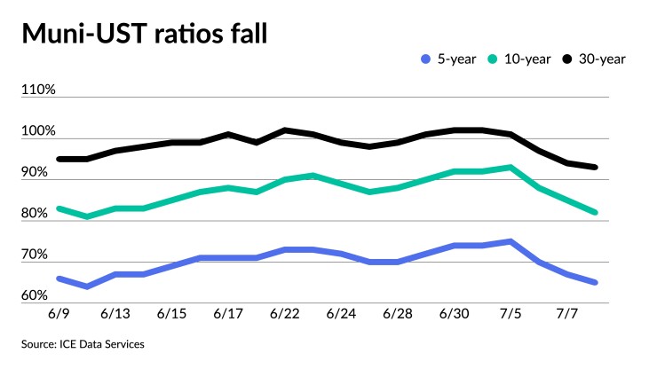 Muni-UST ratios fell again. They were at 65% in five years, 80% in 10 years and 92% in 30 years, according to Refinitiv MMD's 3 p.m. read. ICE Data Services had the five at 65%, the 10 at 82% and the 30 at 92% at a 4 p.m. read.