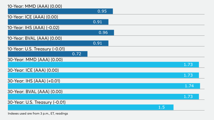 The BVAL AAA curve showed the yield on the 2021 maturity unchanged at 0.11%, the 2022 maturity unchanged at 0.13%, the 10-year flat at 0.91% and the 30-year steady at 1.71%.