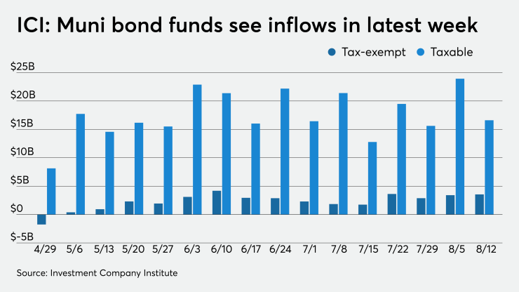Long-term municipal bond funds and exchange-traded funds saw combined inflows of $3.545 billion in the week ended Aug. 12, the Investment Company Institute reported Wednesday.