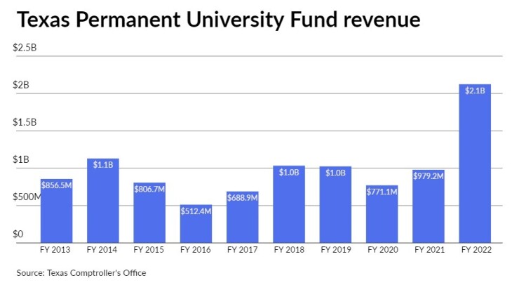 For fiscal 2022, which ended Aug. 31, the University of Texas had nearly $3.5 billion of PUF debt and $7.5 billion of revenue bonds outstanding.