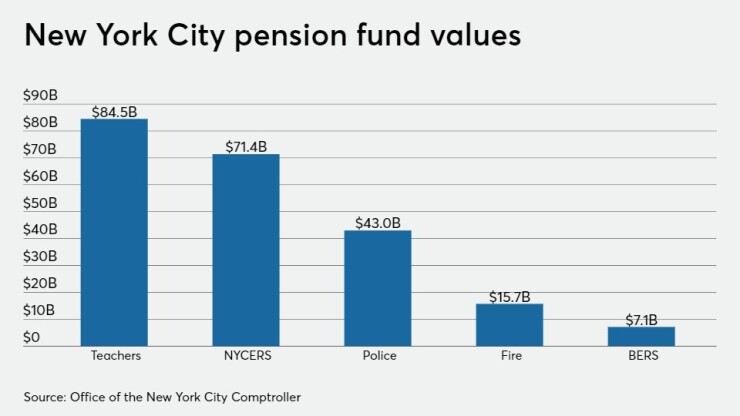 The pension funds have a combined $221.6 billion in assets under management as of July, according to city Comptroller Scott Stringer’s office, and constitute the fourth largest public pension plan in the U.S.