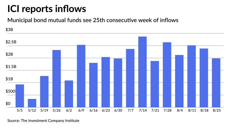 The Investment Company Institute reported $1.985 billion of inflows into municipal bond mutual funds for the week ending August 25, following $2.385 billion of inflows the prior week.