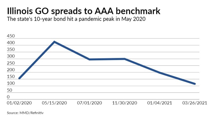 But by late Friday and early Monday spreads on Illinois bonds tightened. On Monday Refinitiv-MMD tightened spreads along the scale to the AAA benchmark by seven to 10 basis points.
