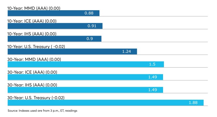 The IHS Markit municipal analytics curve showed short yields steady at 0.07% and 0.08% in 2022 and 2023, respectively. The 10-year yield was at 0.90% and the 30-year yield at 1.48%.