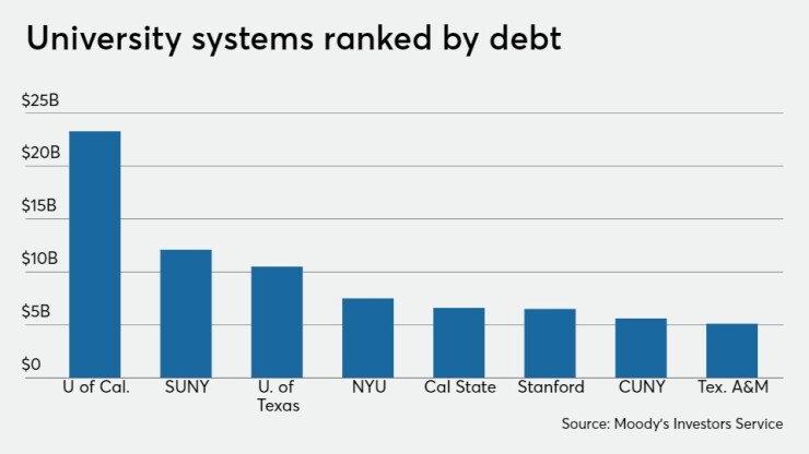 According to Moody’s Investors Service, the UT System ranks third in the nation in debt load with $10.5 billion. The University of California System tops the chart with $23.3 billion, followed by State University of New York with $12.1 billion. The top 10 issuers in the nation account for about 30% of the higher education debt, according to Moody’s May 12 sector report.