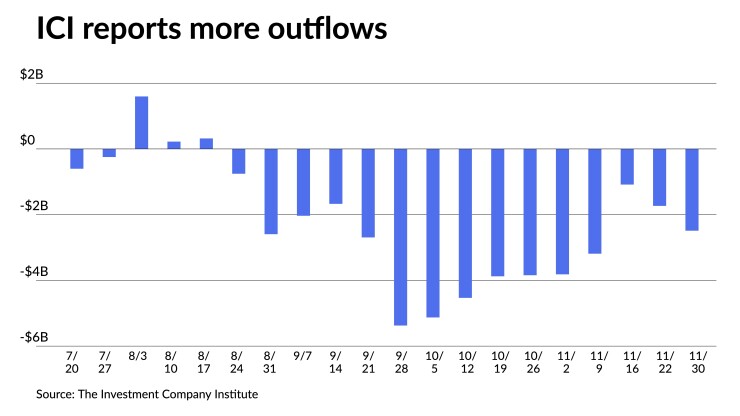 Outflows intensified with the Investment Company Institute reporting that investors pulled $2.488 billion from mutual funds in the week ending Nov. 30 after $1.733 billion of outflows the previous week.
