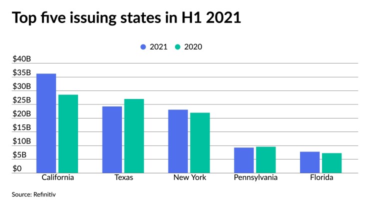The top five issuers in the first half of 2021 were California with $36.229 billion, a 26.9% increase year-over-year. Texas issuers sold $24.239 billion, a 10% decrease. New York was at $23.095 billion, a 5.1% increase from 2020. Pennsylvania rose to fourth from sixth with $9.273 billion, but issued 3.2% less than a year prior. Florida rounded out the top five with $7.507 billion, a 3.6% increase.