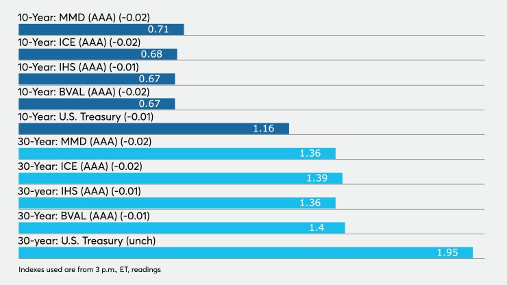 The IHS Markit municipal analytics AAA curve showed yields at 0.08% in 2022 and 0.09% in 2023 while the 10-year fell a basis point to 0.67% and to 30-year at 1.36%.