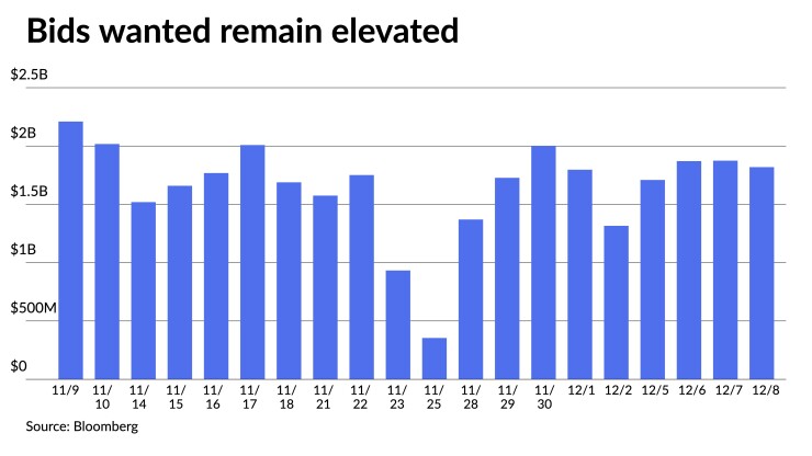 "Total issuance for the month will be low due to the Fed meeting and then the holidays, making the demand/supply imbalance quite acute at a time when the market is doing well," they said. "The availability of bonds becomes a real issue as investors tend to keep the bonds they currently hold."