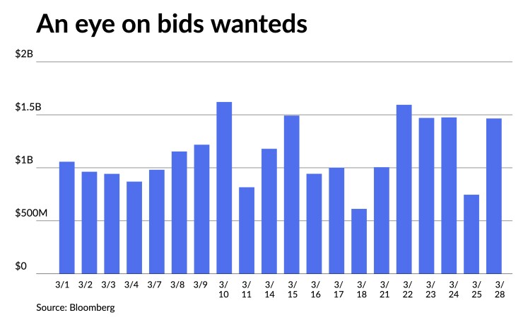 Last week, traded par of $70-plus billion was hit, said MMA's Fabian, but with barely $10 billion of total trading in the primary market, he said much of the action was in the secondary, noting elevated customer sold volumes and bids wanted activity. Bids wanted reached $1.465 billion on Monday, the 27th time this year.