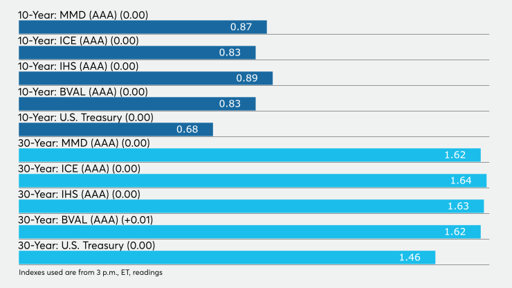 The BVAL AAA curve showed the yield on the 2021 maturity unchanged at 0.11%, the 2022 maturity unchanged at 0.13%, the 10-year flat at 0.83% and the 30-year up one basis point to 1.62%.