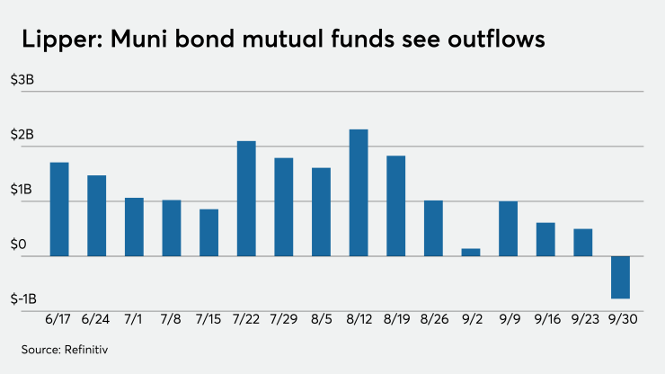 In the week ended Sept. 30, weekly reporting tax-exempt mutual funds saw $774.747 million of outflows. It followed a gain of $498.876 million in the previous week.