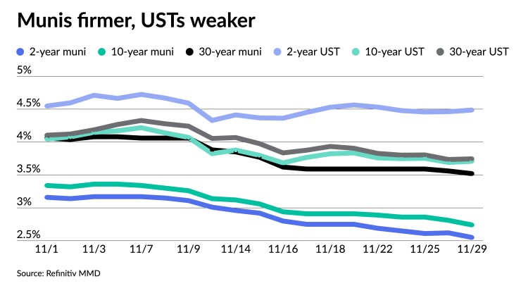 Tax-exempt munis have now regained late September levels, and November's rally has eclipsed October's selloff, noted Matt Fabian, a partner at Municipal Market Analytics