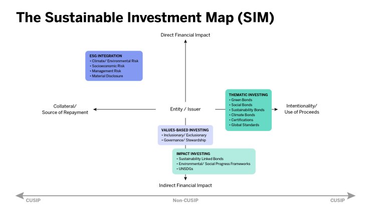 Stated in more fixed income-oriented terminology, these strategies speak to the evaluation of the underlying entity (non-CUSIP) and the security (CUSIP) spectrum — what is securing the repayment of the loan and what are the proceeds of the loan going toward? CUSIP-level evaluations are simply about sources versus uses, which are realized through disparate strategies when accounting for sustainable investing practices. Meanwhile, the sustainable investing strategies also speak to varying degrees of direct and indirect financial considerations, which are usually (but not always) inherent in the sustainable investing strategy. They are a spectrum, not a binary.