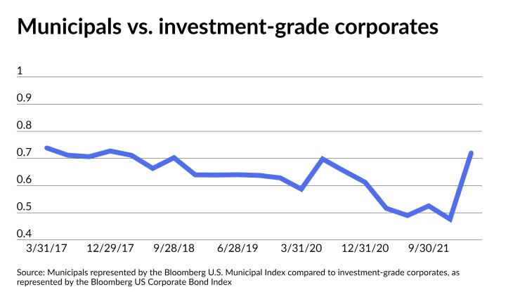 The ratio of municipal bonds compared to U.S. Treasuries in terms of relative value is favorable as well. The current ratio is about 105%, which is higher than we’ve seen in the past five years, when the average was about 93%, despite the notable anomaly of 2020.