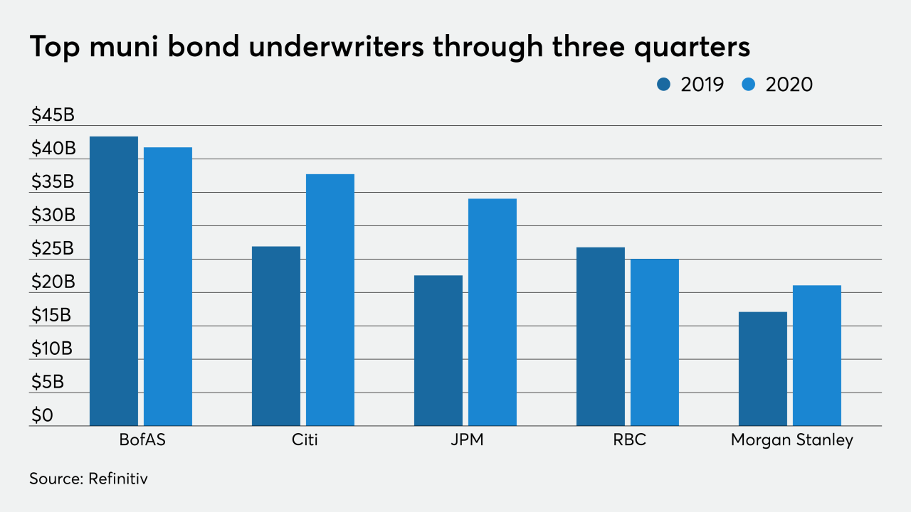 Municipal bond underwriters are on pace to easily surpass last year's total, despite the COVID-19 pandemic. Top bookrunners have accounted for a total of $328.60 billion through the first three quarters of the year, up from the $267.91 billion in the first nine months of 2019. The top five saw small changes compared to a year ago, while spots six through 10 saw more of a mix.