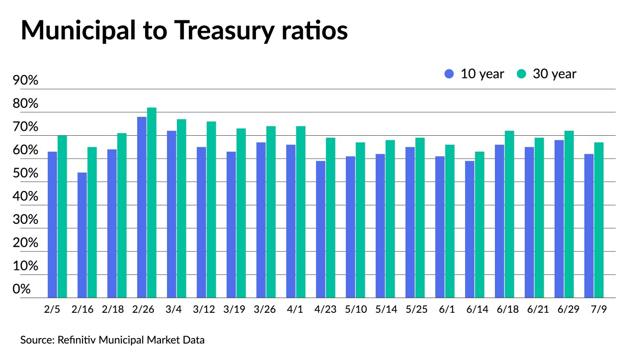 Municipals outperformed U.S. Treasuries for a third sessions moving the 10-year municipal to UST ratio below 60%.