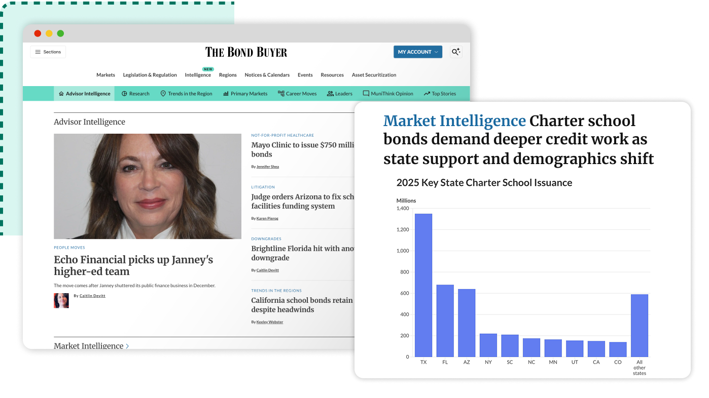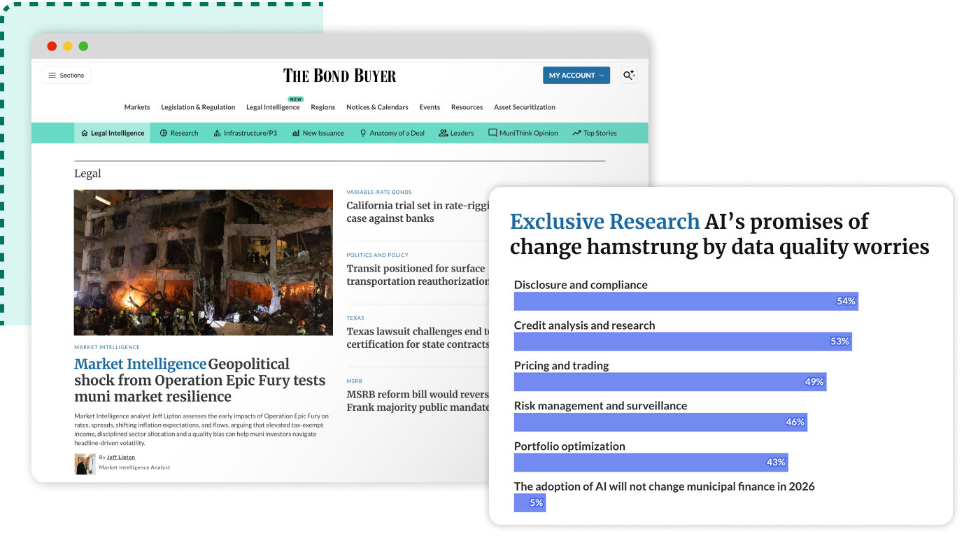 The Bond Buyer’s Market Intelligence platforms bring together trusted reporting, tailored insights, exclusive data, and expert analysis for public finance professionals. Shaped with input from industry leaders, these destinations are designed to help you stay informed, spot what matters, and make smarter decisions faster.
