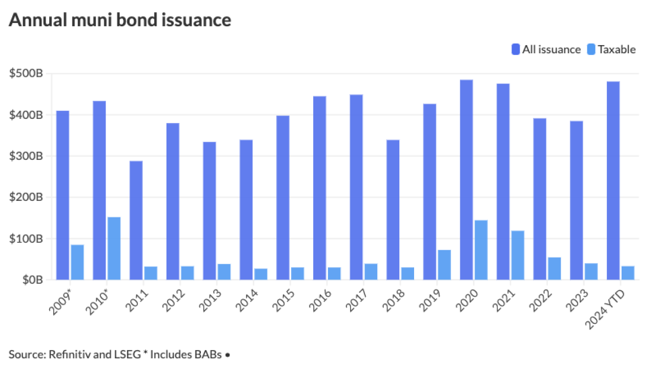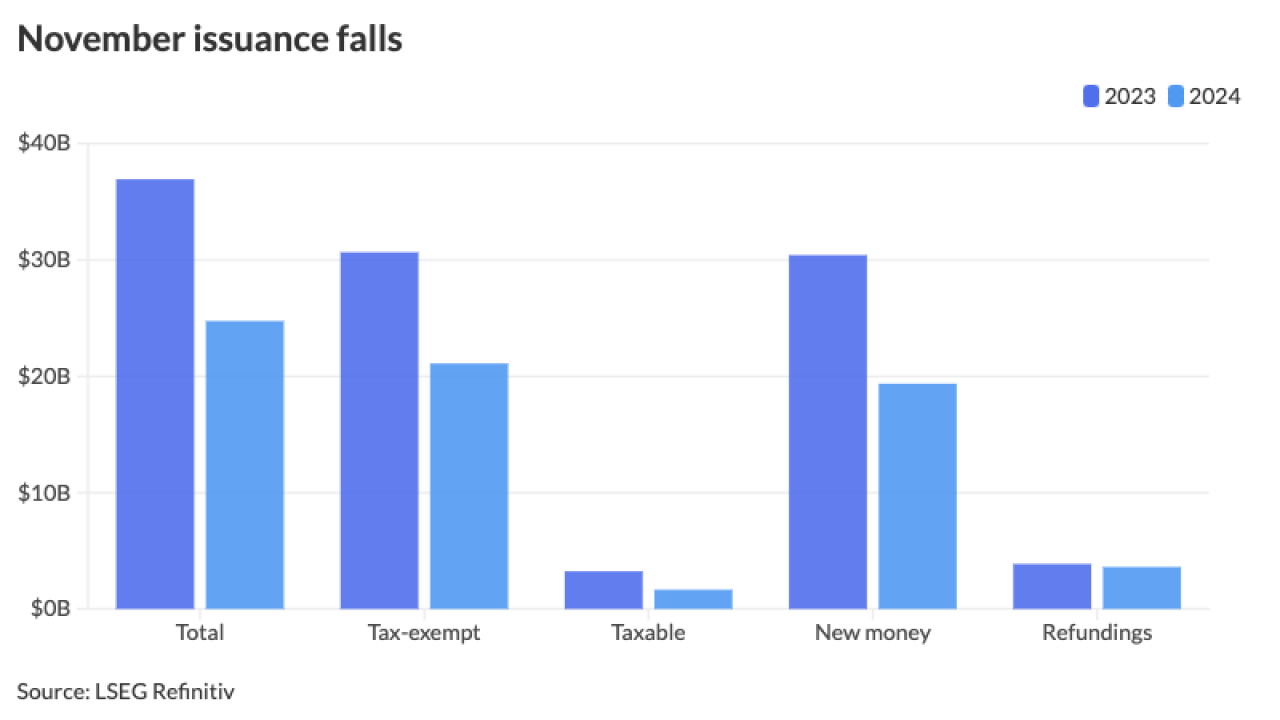 Issuance as of Wednesday is at $345.327 billion, a 32.7% increase over 2023. The Bond Buyer 30-day visible calendar on Monday was at $20.02 billion, the largest in nearly four years.