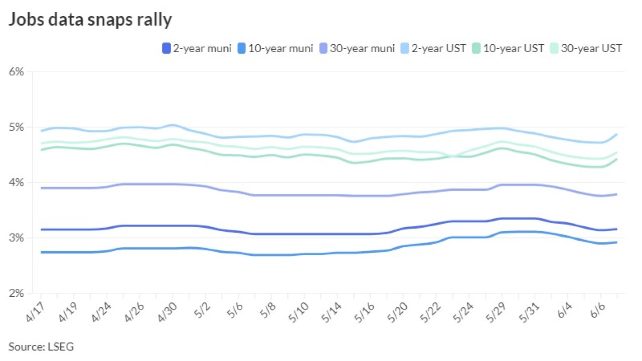 USTs spiked 17 basis points on the short end and 15 to 12 10-years and out following the release, while triple-A curves saw yields rise two to five basis points, depending on the yield curve, in a more muted and typical reaction for the asset class.