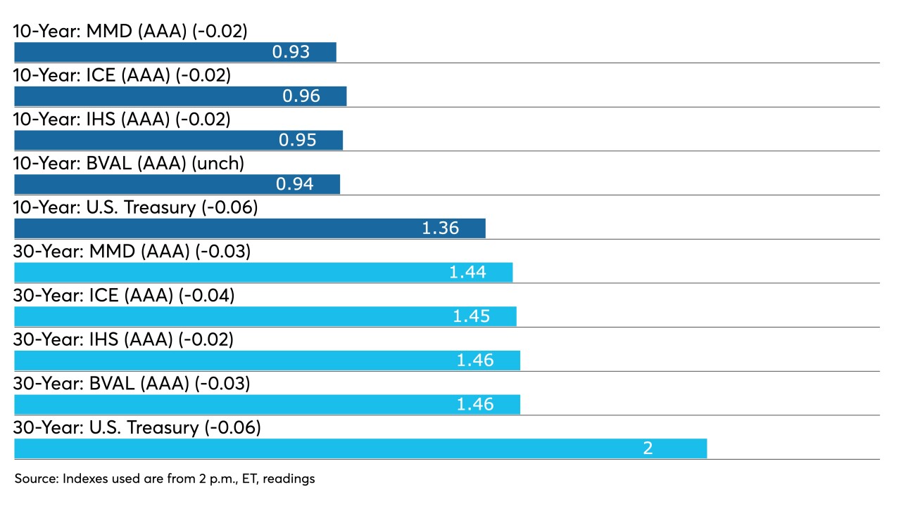 U.S. Treasury 10- and 30-year yields hit February lows. Large blocks of high-grades in secondary trading led triple-A benchmarks to lower yields by two to four basis points across the curve.
