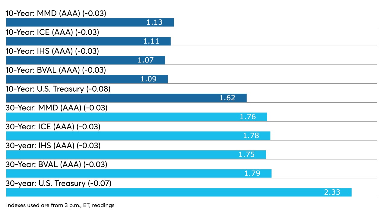 Refinitiv Lipper reported more inflows into municipal bond mutual funds to the tune of $592.4 million. Initial jobless claims fell to the lowest point since the pandemic began, moving Treasuries weaker while equities saw gains.