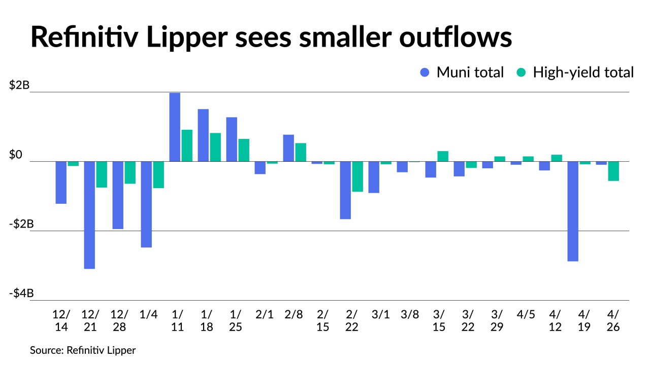 Outflows from municipal bond mutual funds receded as Refinitiv Lipper reported $92.055 million was pulled from them as of Wednesday after $2.876 billion of outflows the week prior.