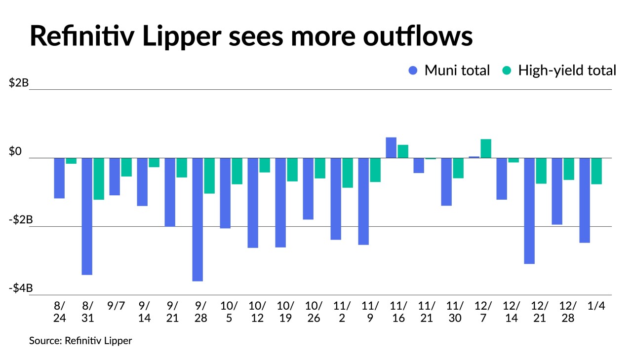 Outflows continued as Refinitiv Lipper reported $2.477 billion was pulled from municipal bond mutual funds in the week ending Wednesday after $1.946 billion of outflows the week prior.