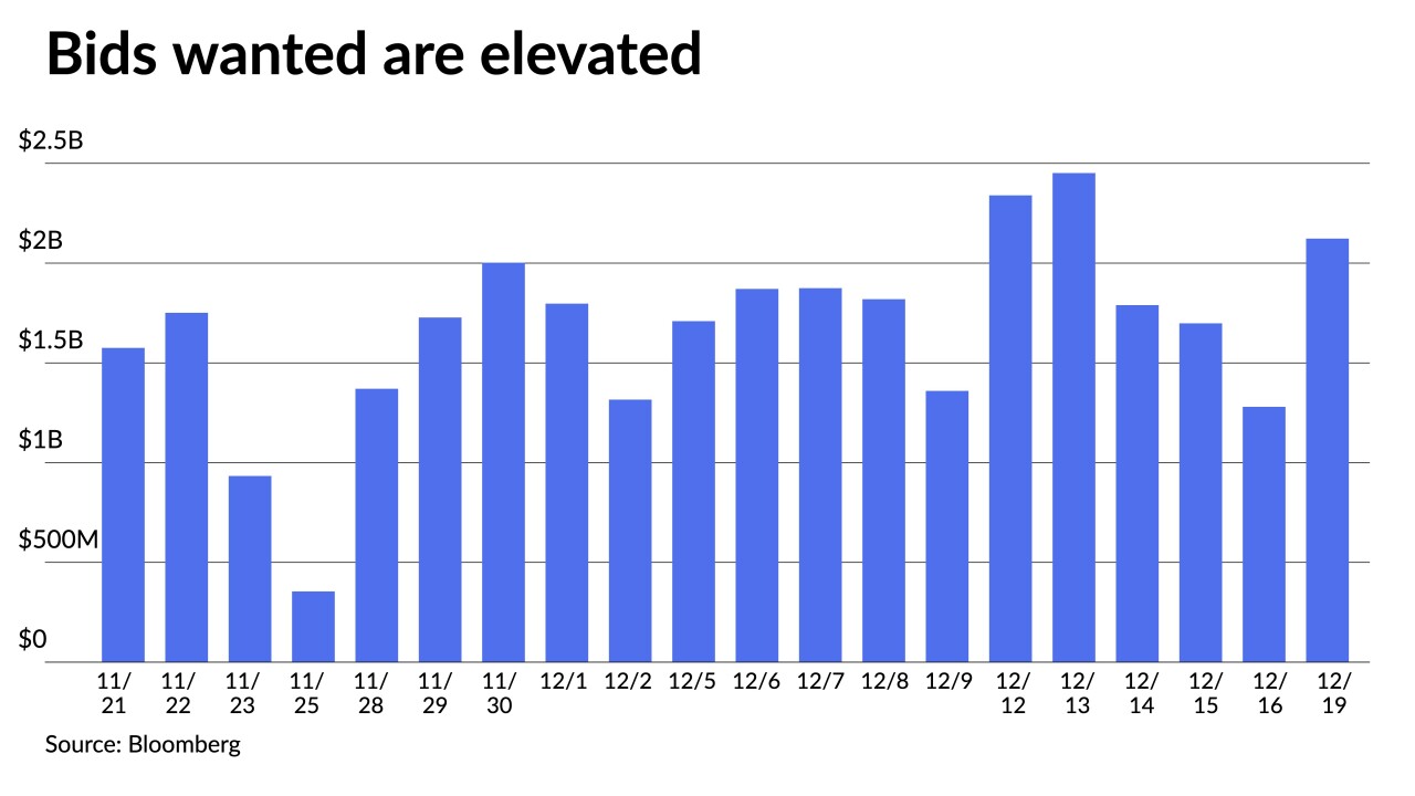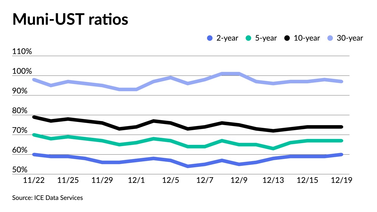 "A fade in muni prices came on the heels of sovereign debt actions, leaving ratios subject to some correction with just a few sessions remaining in 2022," said Kim Olsan, senior vice president of municipal bond trading at FHN Financial.