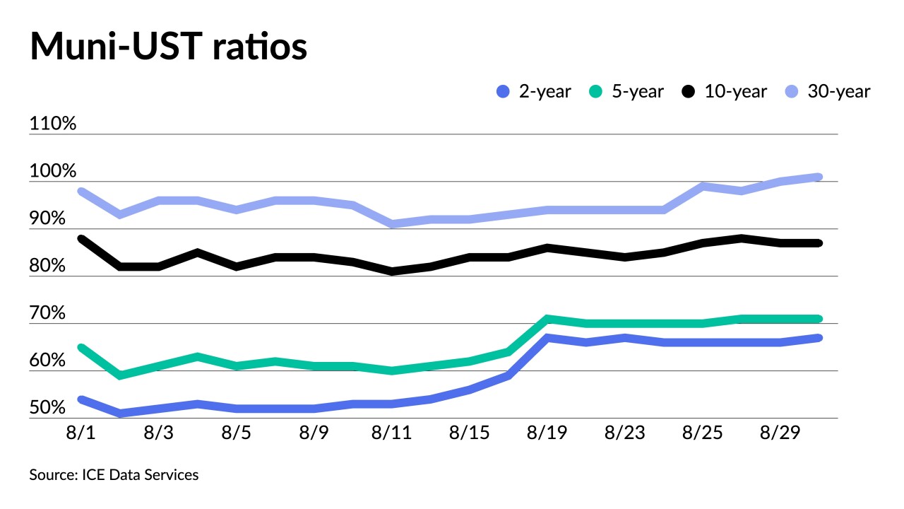 After underperforming USTs last week, "munis have given up their earlier performance advantage for August with both asset classes currently earning virtually the same negative returns," said Jeff Lipton, managing director of credit research at Oppenheimer Inc.