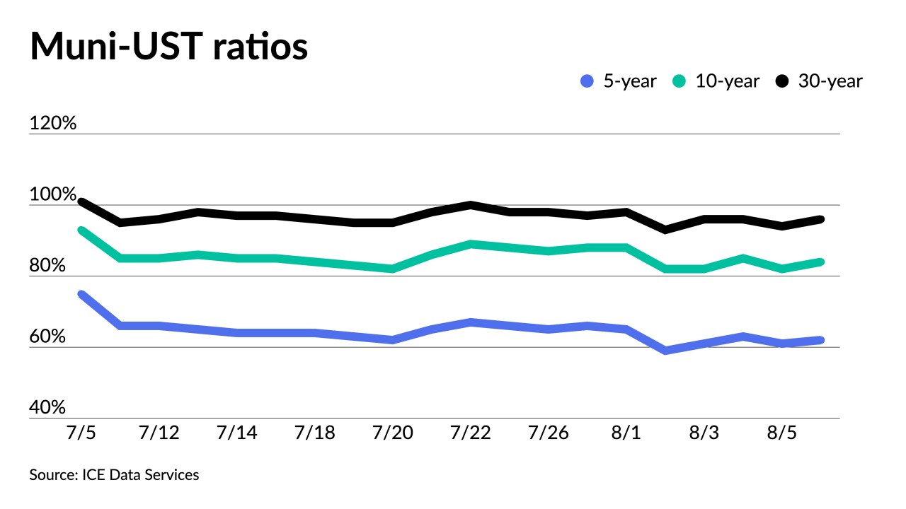Several large new issues priced. Municipal yields were little changed, U.S. Treasuries were weaker on the short end and stocks ended in the red ahead of the much-anticipated July inflation figure.