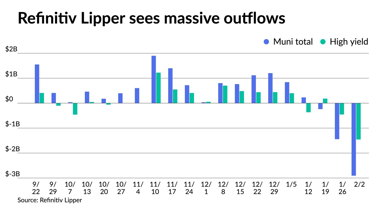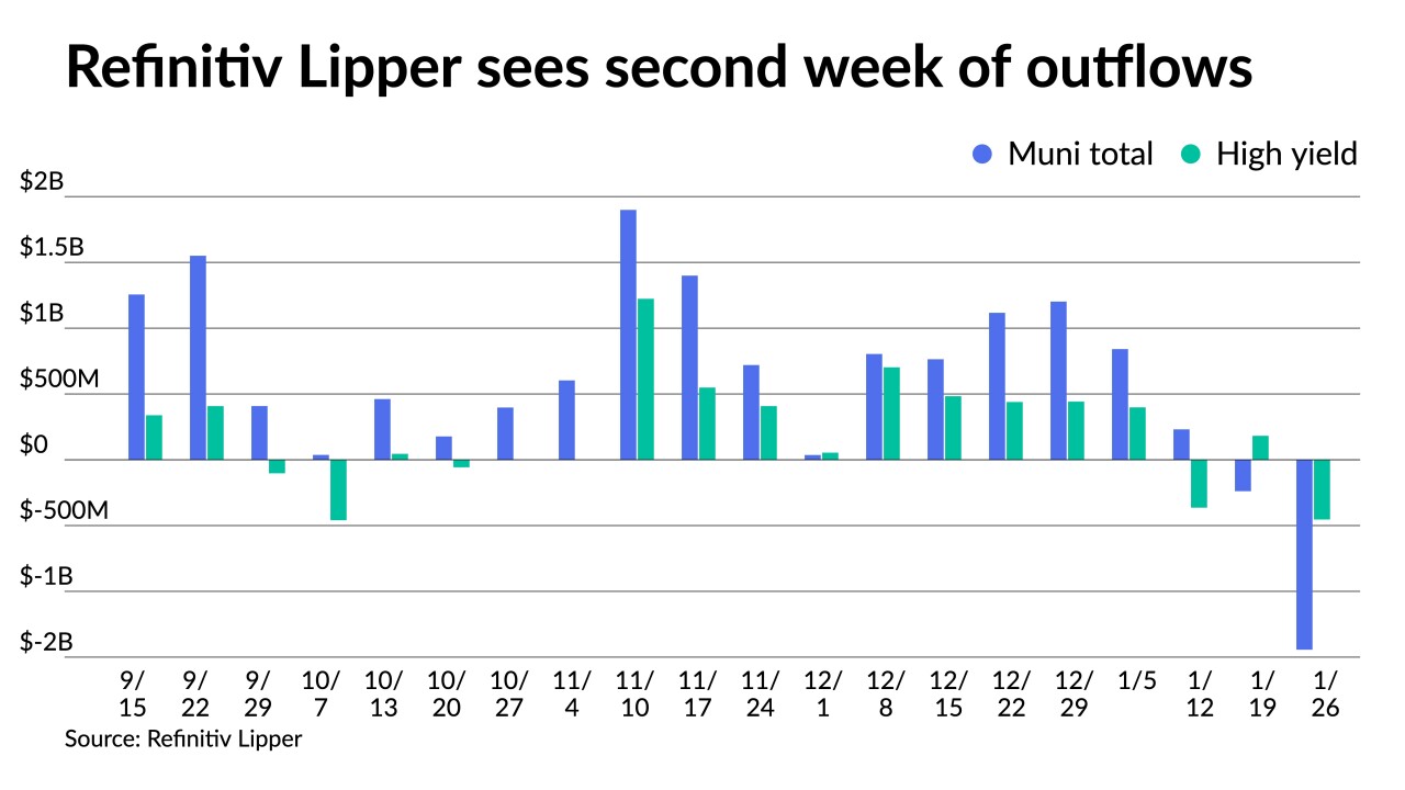 Investors yanked $1.154 billion out of municipal bond mutual funds in the latest week, Refinitiv Lipper reported.