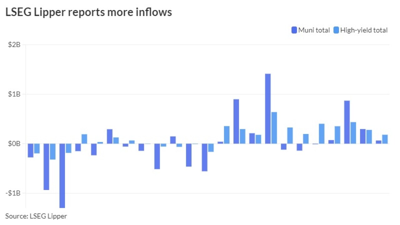 LSEG Lipper reported fund inflows of $447 million while high-yield muni bond funds saw another round of inflows at $246 million, marking the 12th consecutive week of positive flows in that space.