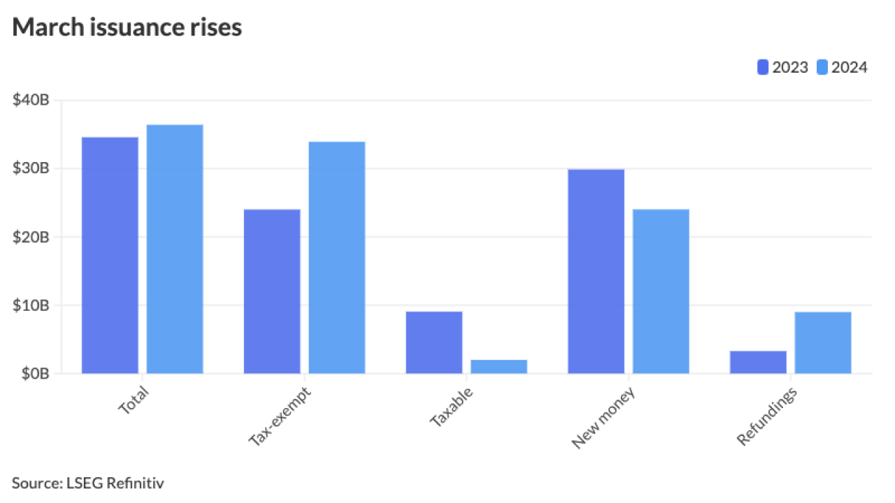 March issuance came in at $36.405 billion, above the $34.579 billion 10-year average, according to LSEG Refinitiv data.