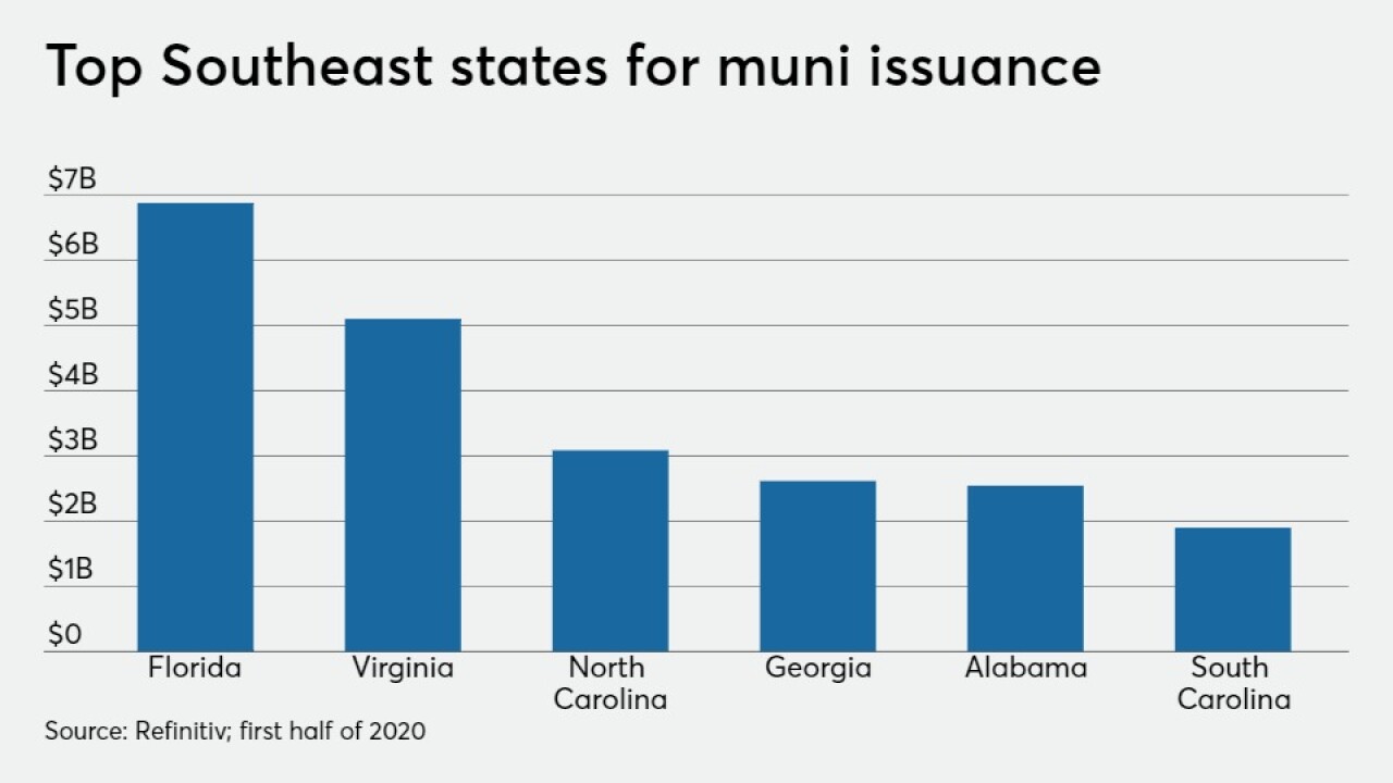 Municipal bond issuers in the Southeast sold $27.7 billion of debt, down 7% year-over-year as the region saw fewer big transportation and prepay gas deals.